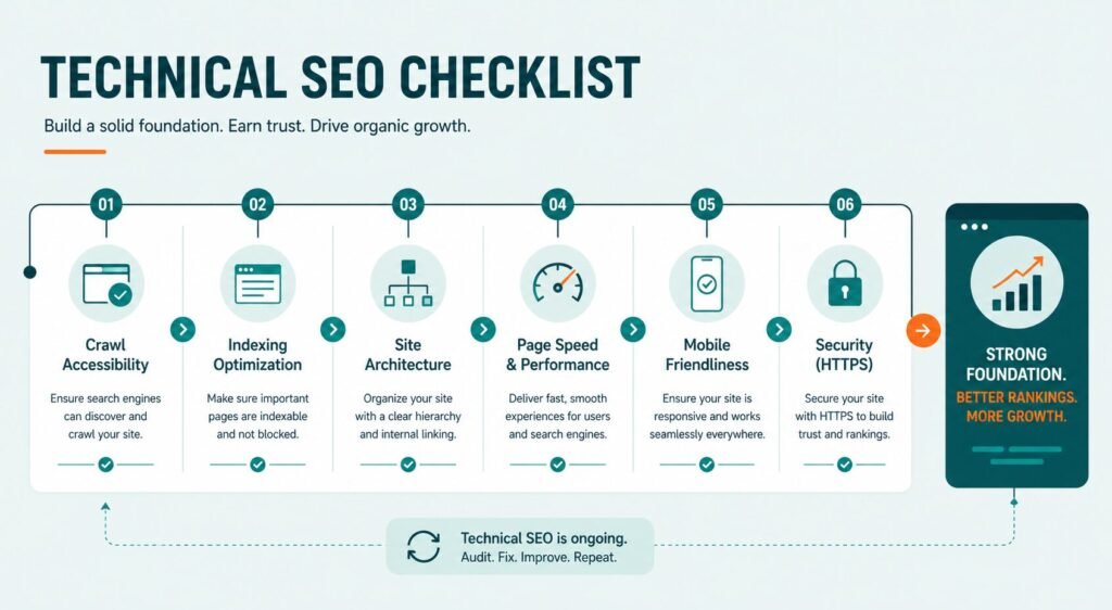 Optimize site architecture, internal linking, and navigation to ensure search engines and users can easily access important pages.