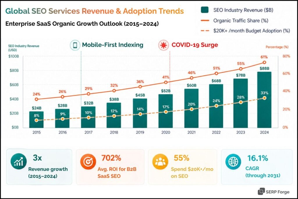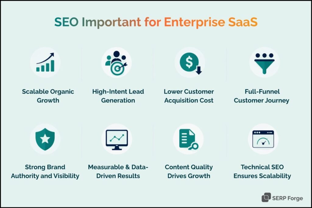 Search Engine Optimization is important for enterprise SaaS because it drives scalable organic growth, improves search visibility, and attracts high-intent users actively looking for solutions.