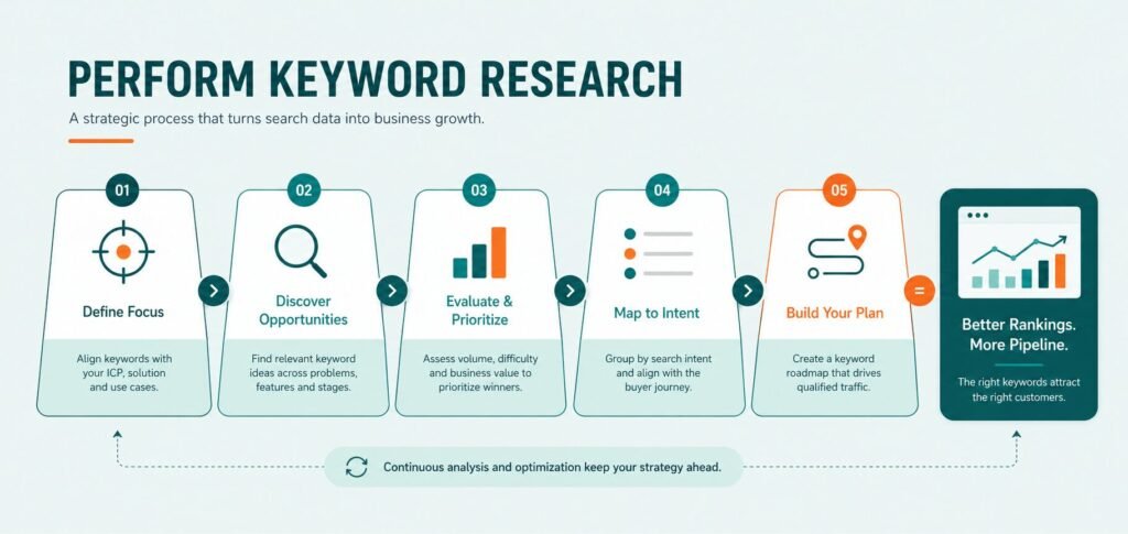 It also involves clustering keywords by topic, analyzing search intent, and prioritizing terms based on business value, search volume, and keyword difficulty. This ensures alignment between organic traffic, user intent, and revenue-generating pages.