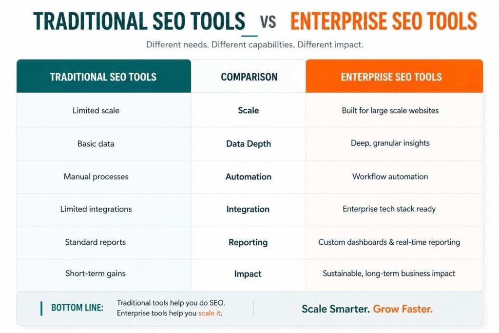 An enterprise SEO tool is built to handle large websites, complex data, and multiple users. It offers scalability, automation, advanced reporting, and integrations in one platform.