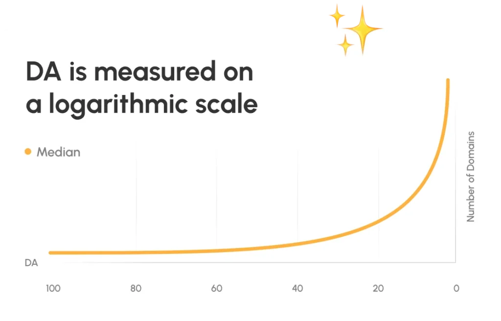 Moz’s Domain Authority is a predictive metric developed by Moz to estimate how likely a domain is to rank on search engines. Moz expresses the DA score on a logarithmic scale from 1 to 100, where a higher score reflects stronger authority signals.